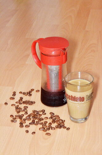 Für einen perfekten Coldbrew wird der Kaffee sehr grob gemahlen, mit kaltem Wasser übergossen und dann lässt man das Ganze über mehrere Stunden im Kühlschrank ziehen.